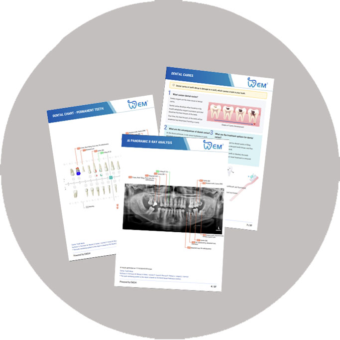 The AI analyses your x-ray images within seconds and highlights areas that may need attention, such as tooth decay, impacted tooth, bone loss and etc. These are shown directly on your x-ray image, helping you understand what is going on at a glance.